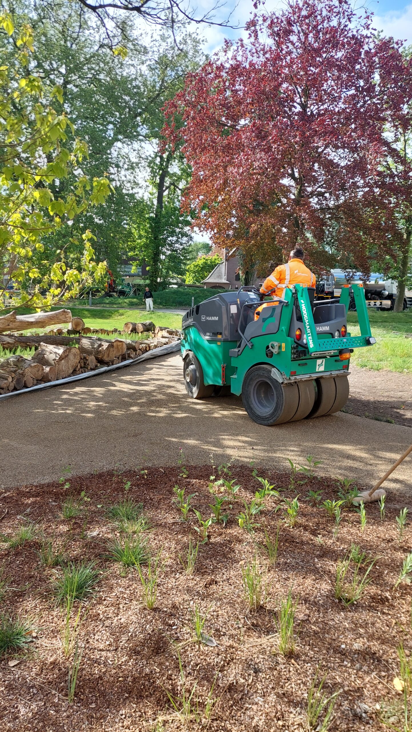 Bestaand asfalt wordt behouden en krijgt een tweede leven door af te strooien met zacht beige grind, wat duurzaamheid symboliseert en afval vermindert. Gerecupereerde teelaarde blijft op de site, waardoor transport en CO2-uitstoot worden verminderd.