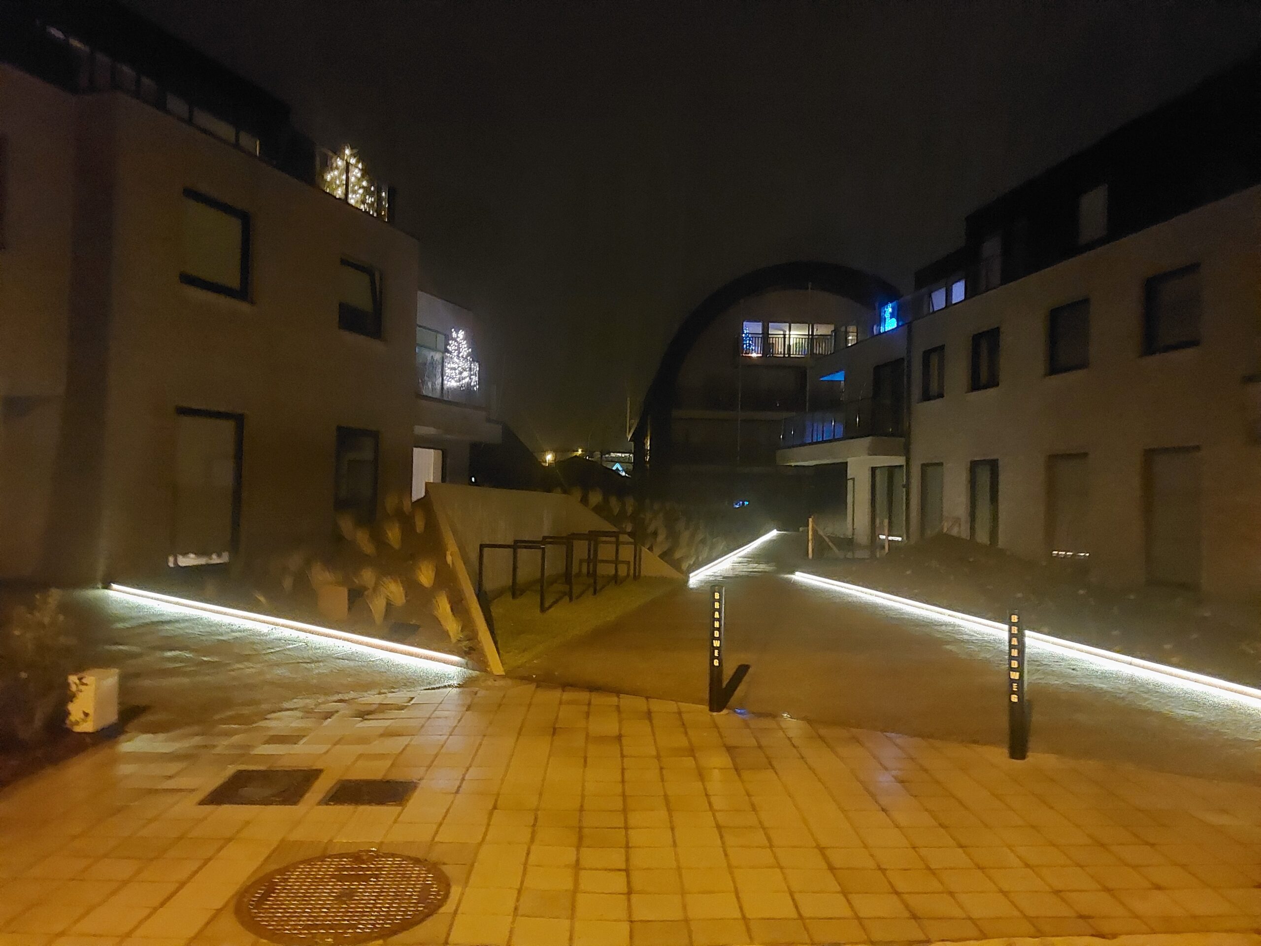 Duurzame oriëntatieverlichting benadrukt het architecturale lijnenspel gedurende specifieke uren, waarbij de verlichting naar beneden is gericht of zich concentreert op specifieke objecten. Met het oog op rust en het verminderen van lichtvervuiling wordt op een bepaald tijdstip 90% van de verlichting verminderd. Er is bewust besloten om het publieke pad niet volledig te verlichten; in plaats daarvan is gekozen voor lichtgevend grind (Glow in the dark) in het betonnen wandelpad. Dit zorgt voor een artistieke ervaring in het donker zonder bij te dragen aan lichtvervuiling.