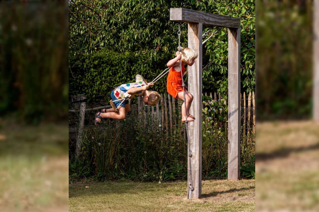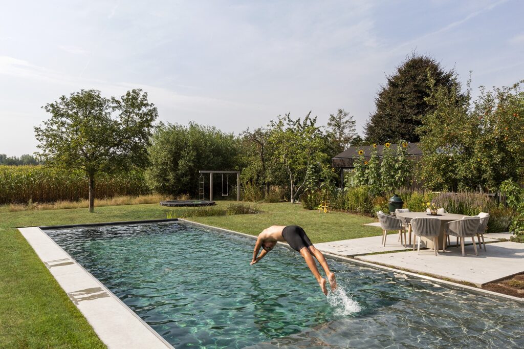 Elk gezinslid vond hier zijn plek: een ruim terras om te ontspannen, een zwembad om van te genieten, een speelzone met schommel en zandbak voor de kinderen, en een pluktuin met kleinfruit voor wie graag oogst uit eigen tuin. De bestaande bomen kregen hun plaats in het ontwerp, zodat het nieuwe geheel wortelt in wat er al was – een tuin die even doordacht als leefbaar is.