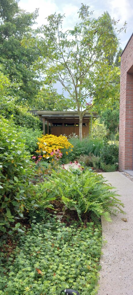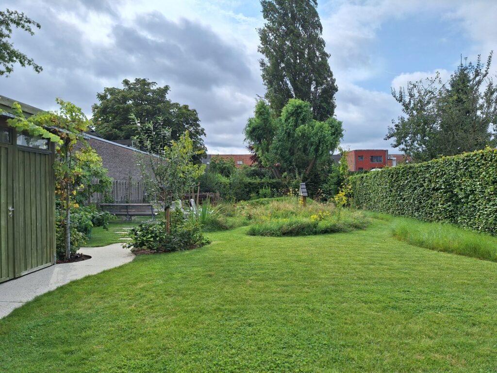 In het nieuwe ontwerp brengen bomen, een wadi en een takkenwal structuur en biodiversiteit. Een plukzone met kleinfruit, een ruim terras en een gezellige zitzone nodigen uit om buiten te leven en de seizoenen te beleven. De tuin bruist nu van leven — voor mens én natuur — en biedt veel meer genietmomenten dan voordien.